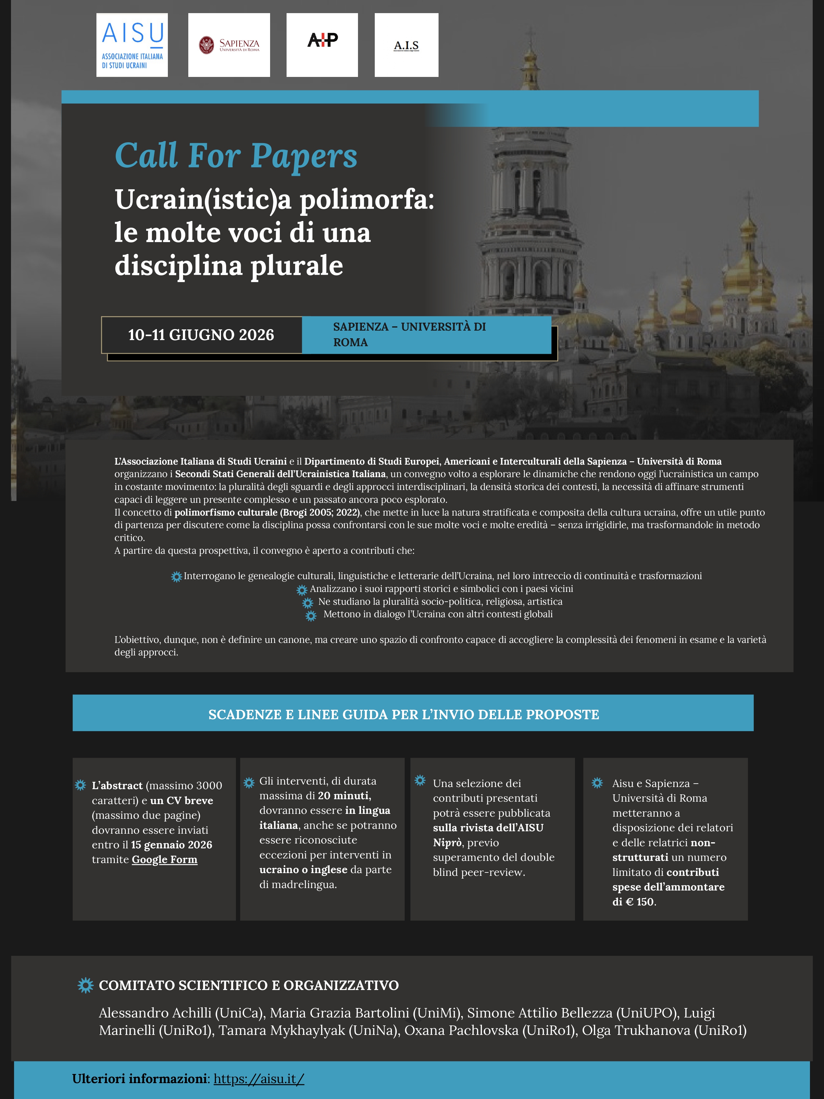 L’Associazione Italiana di Studi Ucraini (A.I.S.U.) è un’associazione culturale senza fini di lucro fondata il 25 maggio 1993 da Gianfranco Giraudo (1941-2024). Già nel 1989 l’Italia aveva ospitato a Napoli e Ercolano un Congresso Internazionale che aveva segnato una tappa importante nella presa di coscienza dell’esistenza della realtà culturale e storica dell’Ucraina negli ambiti accademici e politici italiani, e occidentali in genere. In quell’occasione avvenne infatti la fondazione dell’Associazione Internazionale degli Ucrainisti (MAU), che con la sua intensa attività scientifica e convegnistica ha aiutato a ridisegnare i contorni della disciplina in Europa occidentale.